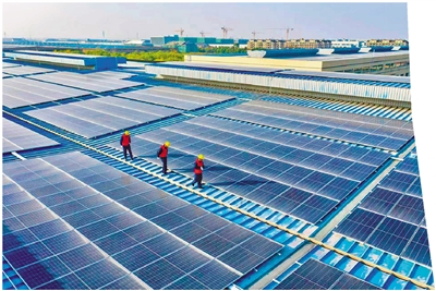 国网绍兴供电公司工作人员在检查企业屋顶光伏设备。通讯员 朱胜均 摄