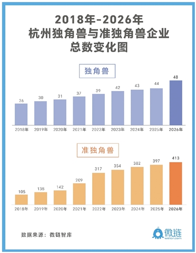 榜单显示,2026年杭州独角兽企业从上一年的44家增长到48家;杭州准独角兽企业从上一年的397家增长到413家。