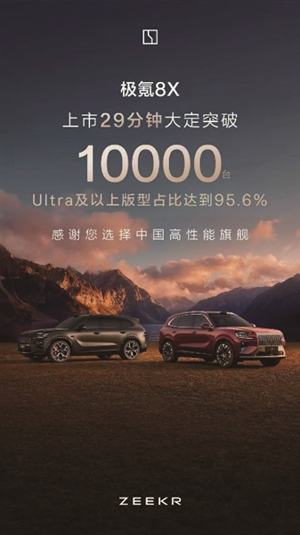 2026年4月17日,极氪8X超级电混高性能旗舰SUV重磅上市,凭借越级产品力与诚意十足的定价,上市仅29分钟大定订单便突破10000辆,其中Ultra及以上高阶版型订单占比高达95.6%,一举引爆高端新能源SUV市场,成为细分领域现象级爆款车型。新车限时臻享权益后售价32.98万元起,曜影版本限时售价47.38万元起,上市权益有效期为2026年4月17日至5月31日24:00,支付5000元定金即可解锁全方位购车福利。