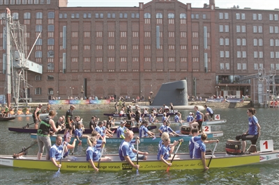 6月10日,人们在德国杜伊斯堡参加趣味龙舟赛。9日至11日,德国民众在趣味龙舟赛中逐浪竞渡。据赛事宣传册介绍,140支队伍、3000名选手参加本次龙舟赛,其中既有华侨华人和留学生代表,也有德国鲁尔都市孔子学院的青年学生和当地龙舟爱好者。