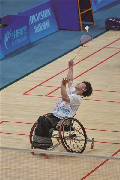 羽毛球 10月24日,在杭州滨江体育馆举行的亚残运会羽毛球男子单打WH1 1/4决赛中,中国选手屈子墨2∶0战胜泰国选手,晋级四强。 摄/记者 李子逸