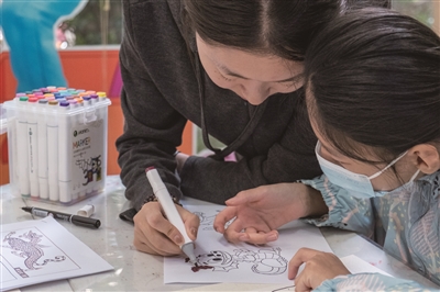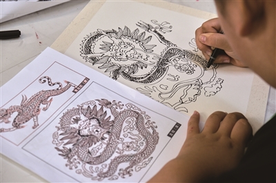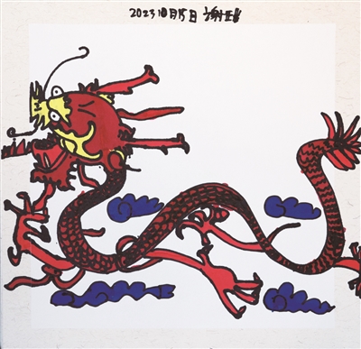 画中国龙这么复杂的图案,陈易含不但上课认真,家里还偷偷练习,两节课之间有不小进步。