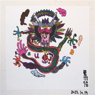 夏雨恬、张淑琴和王燕萍三位同学是老学员,绘画能力强。她们不需要老师们特别指导,在配色上也颇有个人风格。夏雨恬用墨绿和朱红打底,房子琦老师不禁感叹“真是国风感满满”。张淑琴用彩虹七色,色彩明亮,炫丽又和谐。王燕萍的中国龙以褐色为主,周身还散发着金光,充满神秘感。