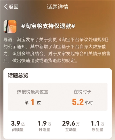 12月27日,#淘宝将支持仅退款#登上微博热搜第一,截至18点,获3.9亿阅读量和1.9万讨论量