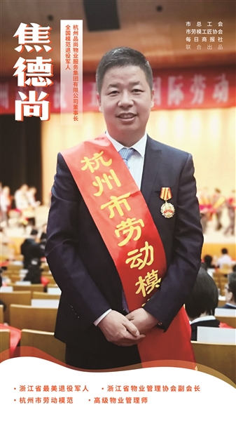 在杭州市余杭区五常街道的杭州品尚物业服务集团有限公司内,立着几个“炮弹”模型,那是焦德尚对27年前军旅生活的纪念。1996年的冬天,怀揣着军营建功的梦想,18岁的焦德尚走出河南大山,应征入伍,来到驻杭某部服役;然而一次意外的负伤,打断了他的梦,伤好后他被调任为通信员,这让原有一腔抱负的焦德尚内心失落不已。“那是种想做点什么但是又什么都做不了的无奈。”虽然不能奋斗在一线,但凭着敢闯敢拼、脚踏实地的韧劲,焦德尚还是在岗位上获得了“优秀士兵”称号,还被嘉奖过一次。