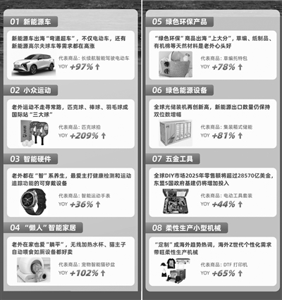 这一年的关键词,也是未来的机会点。阿里国际站预测,2024年数字外贸八大蓝海赛道,新能源车、小众运动、智能硬件、“懒人”智能家居、绿色环保产品、绿色能源设备、五金工具、柔性生产小型机械等上榜。记者观察这份预测榜单,发现“新能源”“绿色环保”“个性化”和“智能”成为四大关键词。