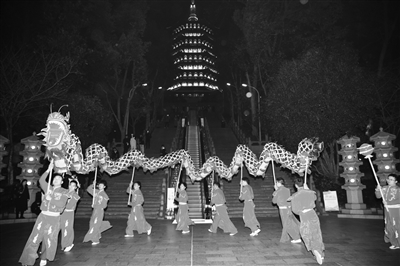 当晚,一条锦色长龙在雷峰塔108级台阶前翻腾起舞,点燃现场的欢庆气氛。名为《龙腾塔影》的舞龙表演将雷峰塔登高祈福文化与龙年传统民俗相结合,以“龙步震开盛世春”的美好寓意,祈福新岁万象呈瑞。(记者 朱荣)