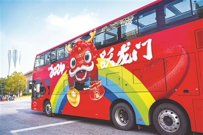 昨天,记者在湖滨公交站和武林广场西公交站看到了这辆巴士,车身整体为红色,两侧印有“2024跃龙门”的字样,且各绘着一条圆鼓鼓的龙,龙爪一只拿着福袋,一只拿着元宝,可爱又喜庆。