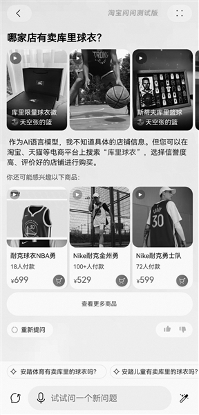 “淘宝问问”界面截图,AI针对提问为记者找到平台内的产品视频和链接,就像导购一样