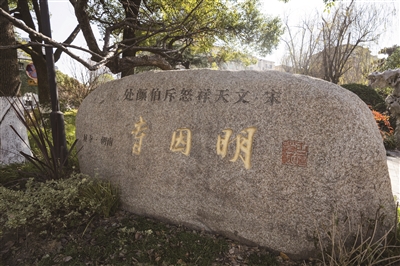 ①明因寺遗址公园正门口,卧有一块大石,上面刻有“明因寺”三个大字