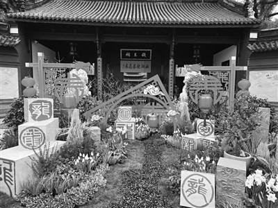 走进钱王祠大门,迎面的巨型龙鼓澎湃出强劲的新年气势,叫人眼前一亮;红红火火的“绸带”萦绕着“福临门”,满是喜气洋洋。放眼四周,各色红梅、蜡梅、造型大茶梅、洋水仙、郁金香花团锦簇,硕果累累的除了金桔、橘子,还有如玛瑙籽似的红果冬青;瑞香花开得清新扑鼻,香柏也挺直身板,散发出迷人芬芳,在万盆嫣红翠绿的装扮下,殿前广场靓丽非凡。