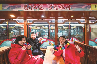 龙年的氛围越来越浓,运河上的一些游船开始挂起了龙灯,这些游船都有个喜庆的名字——大运龙灯福气船。全新“涂装”的游船上安装了3米长的“龙头鱼尾”手工鳌鱼灯,船身两侧贴上了龙纹窗贴,船舱内部也是充满了各种龙的元素。