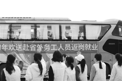 2月17日,在云南省红河哈尼族彝族自治州蒙自市,志愿者与工作人员欢送外出务工人员。务工包车、春风送岗、直播招聘……各地采取多项暖心举措,助力节后人们返岗就业。