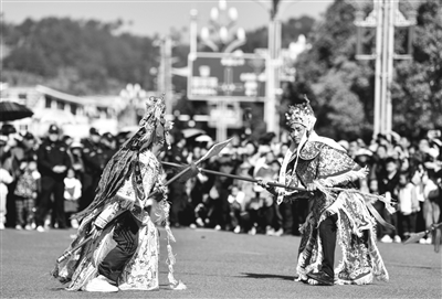 2月18日,人们在贵州省龙里县民俗踩街活动中表演太平花灯戏。当日是正月初九,龙里县举办主题为“金龙贺岁·欢欢喜喜过龙年”的民俗踩街活动。