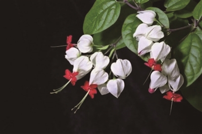 春夏开花的龙吐珠,花形新颖奇特,白色的萼片,红色的花冠,相映成趣。未开花时,白色萼片合拢,好像一个个小灯笼。盛开时深红色的花冠由白色的花萼内伸出,酷似白色游龙吐出了红色的珠子,故而得名。适合作盆栽观赏,也可作花架或垂吊盆花布置。