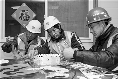 2月23日,位于杭州市富阳区的中建三局银湖生物信息产业园项目部举办迎元宵活动,工人们一起制作节日装饰品、吃汤圆,喜迎佳节。这是工人们在项目部食堂一起制作龙年节日装饰品。