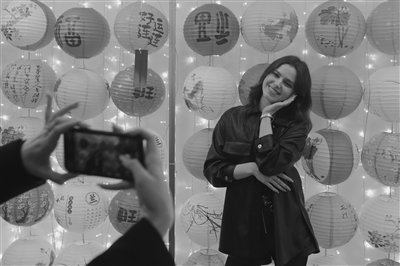 2月23日,在罗马尼亚布加勒斯特中国文化中心,一名女子参加猜灯谜活动时拍照留念。