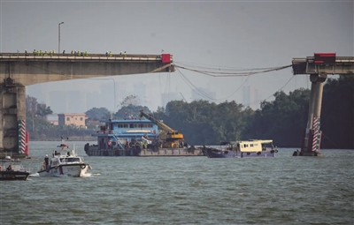 广州市交通运输局总工程师邹小江介绍,被撞受损的沥心沙大桥19号桥墩倾斜严重,存在进一步失稳风险。为避免发生次生灾害,需进一步拆除19号至20号桥墩跨梁,消除安全隐患。