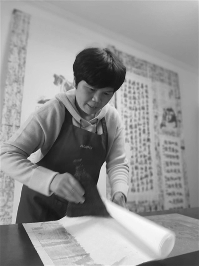 做装裱修复如同修行,只有积累足够多的案例经验,才能让技艺更为精湛,余泽英深谙此理。日复一日年复一年中,她在揭裱修复方面渐渐有了心得,出师后又在家里成立了自己的装裱工作室,因突出的技艺,她在行业中慢慢获得了口碑,不少人慕名送来书画作品,其中不乏传世名作与书协、画院或纪念馆的展览作品,在众人看来,只因她这位“书画裁缝”能让艺术拥有最合适的“衣裳”,绽放异彩。
