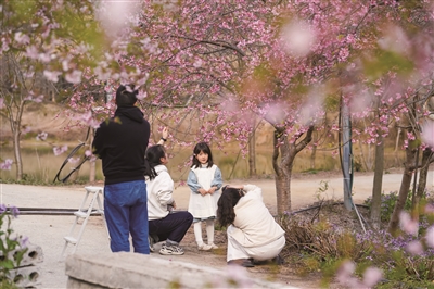 余杭区的杭州樱花园内,6万株樱花次第绽放,迎来最佳观赏期。昨天,有不少游客在赏樱游玩。