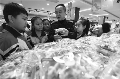 3月13日,河北省邯郸市邯山区市场监管局贸易分局的工作人员在指导火磨小学的学生辨识安全食品的方法。