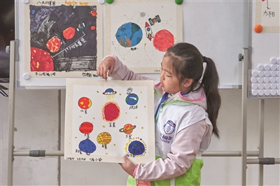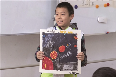 教室内,有些同学有些特别,他们的画超出了我们平时想象中星球的模样,但他们依然能大胆上台介绍自己的作品。我们交流时他们也不会很害羞,都是笑嘻嘻的。