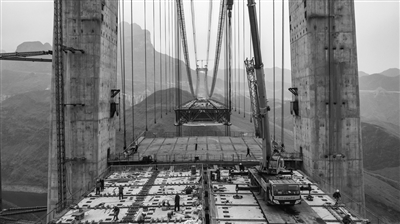 3月20日,贵州交建集团工人在贵州省晴隆县和普安县交界处的牂牁江大桥桥面进行施工(无人机照片)。近日,纳(雍)晴(隆)高速公路牂牁江大桥建设进入冲刺阶段,大桥已完成64个节段吊装,整体施工进度达97%。这座大桥全长1849米,主跨1080米。