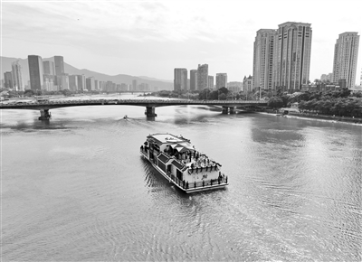 3月21日,福建首艘自主设计建造的纯电动大型高端客船“闽江会客厅”在闽江首航。全船长度38.48米,型宽10.1米,能够载客212人,满载时最大航速达20公里/小时,在观光航速航行下,其续航力可高达10小时。这是“闽江会客厅”纯电动客船在闽江行驶(无人机照片)。
