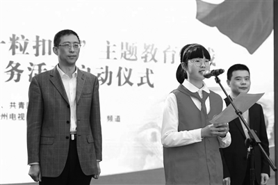 2022年“扣好人生第一粒扣子”小志愿者亚运服务活动启动仪式上,王鑫作为杭州市红领巾志愿服务队队长宣读倡议书