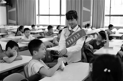 王鑫在采荷三小为暑托班学生做气象科普讲解