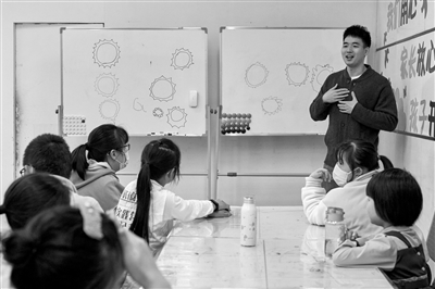 一开始,沈老师神秘地在白板上画了一个太阳,请了几位小朋友上前,要求画出和他一模一样的太阳。每位同学都努力按照老师的模板去画,但总有差别。有的大一些,有的小一些,有的画得像一朵花,有的把太阳边缘的光芒画得像刺猬。
