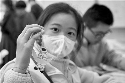 老师给我们每人发放了一张热缩片,可以用马克笔画出自己喜欢的各种宇宙星球、火箭等。我画了一个太阳和一个地球,并成功地做成了小挂件。而我旁边的孤独症小姐姐则画了一个栩栩如生的宇航员,真可爱!