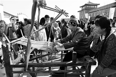 4月4日,在山东省滨州市阳信县水落坡镇举行的第十四届黄河三角洲民俗文化节上,当地乡村社火队展示传统生产、生活技艺,“老把式”登上文化舞台,还原鲁北乡村传统民俗风情。这是水落坡镇乡村社火队队员在演绎鲁北乡村的老粗布织布场景。
