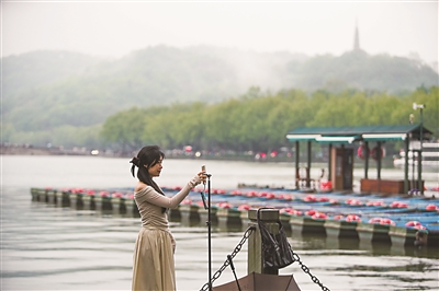 昨天,雨中的西湖,云雾似轻纱拂动,如梦如幻,呈现出别样的美感,如同一幅水墨画。图为游客在西湖边赏景自拍。