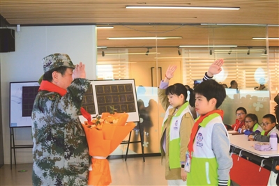 活动开始前,当身着迷彩服、胸前别着亮闪闪勋章的两位退役老兵出现在孩子们面前的时候,掌声雷鸣般响起,小记者代表为两位共和国功臣系上红领巾,并献上精心准备的两束鲜花。