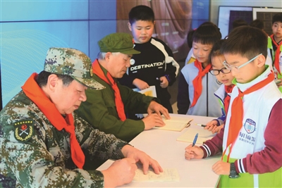 随着活动渐入尾声,小记者们笔记本上的记录也逐渐丰满起来。活动结束后,孩子们仍不愿马上离去,而是一个个拿着本子排起长队,等待老兵签名、合影。为什么要找老兵签名?小记者陈均晏脱口而出:“因为他们是人民英雄。”