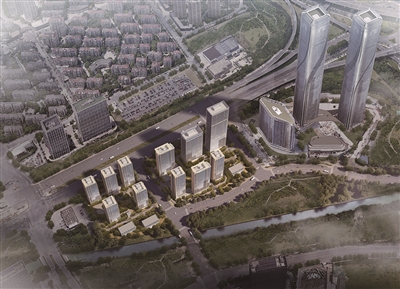 其中,东面地块容积率3.4,包括4幢住宅、2幢写字楼、1幢商业(餐饮)楼,写字楼最高130米。南北两列排布,最大楼间距58米。