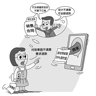 商报讯 (见习记者 毛雨希 制图 裘昀) 消费者张女士于去年8月20日与西湖区古墩路671号司哲丽家居签订了一份销售合同。“新家即将交付,我想要找一家靠谱一点的装修公司,这家店的广告吸引了我。去年8月20日我们去店里看设计图,当时我们对方案并不满意,提出修改意见后,对方列出报价清单并表示可以打折,但折扣价需要我当天签署销售合同才能保留。我提出疑惑,对方表示这样不算下订单,我便支付了全款的一半费用。”直到3月2日,张女士收到了设计师的效果图,“我认为和之前的设计图没有区别,我觉得这家店无法达到我想要的装修效果,因此我向商家提出退款,但商家认为是我违约,要扣除20%的违约金。对此我并不认可。”于是,张女士向本报维权热线85188518反映了此事。