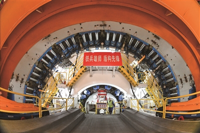 4月18日,全长15.57公里的通苏嘉甬高铁苏州东隧道开始盾构掘进。苏州东隧道是通苏嘉甬高铁全线控制性工程,设计时速350公里,采用单洞双线设计,是目前国内在建里程最长的城市高铁隧道之一。本次掘进的盾构机开挖直径达14.81米,总长134米,总重4200吨,装机总功率达1万千瓦。这是中铁十四局工作人员在盾构机内巡查。