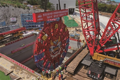 4月18日,甬舟铁路金塘海底隧道宁波侧“甬舟号”盾构机刀盘顺利吊装下井,为这条海底隧道盾构机始发穿海奠定基础。甬舟铁路金塘海底隧道西起宁波市北仑区,东至舟山市金塘镇,全长16.18公里,其中盾构段长11.21公里。甬舟铁路西起宁波东站,线路全长约77公里,设计时速250公里。这是“甬舟号”盾构机刀盘被履带式起重机从地面吊运至甬舟铁路金塘海底隧道宁波侧盾构始发井(无人机照片)。