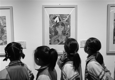 4月19日,西藏首届特殊教育学校学生美术作品展在西藏美术馆举办。现场展出的百余幅画作出自残疾学生之手。这是拉萨市的小学生在参观画展。