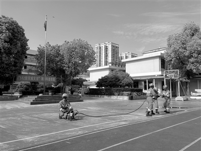 商报讯 (记者 徐敏月 通讯员 赖橼瑗) 无人机消防侦查监测、液压钳破钢管、消防带出水、6米拉梯攀登二楼……4月24日,来自朝晖消防救援站的消防员们,在朝晖实验小学“512防灾减灾日 消防车进校园”活动中亮出了各项看家本领,引起了在场学生的阵阵惊呼。