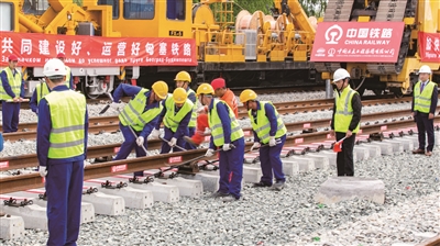 4月25日,在塞尔维亚北部城市巴奇卡托波拉,匈塞铁路项目施工人员进行匈塞铁路轨道合龙工作。匈塞铁路诺苏段起自塞尔维亚诺维萨德站,终至塞尔维亚和匈牙利边境,线路全长108.1公里,于2023年4月6日启动铺轨。