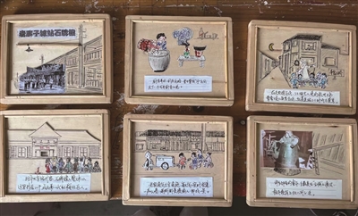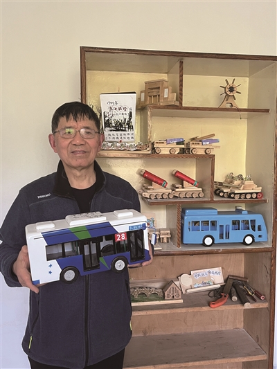说干就干,缺少木料,他就自己去小区内拾捡,没有图纸支撑,他就自己创作。利用自己的记忆,勾勒墨线、锯子锯形、磨平修整、组合安装,复刻出一系列如剧院、各路公交车、红船、桥梁模型,西湖十景及各类20世纪杭州街景版画等作品。一块块不起眼的废木,经过他的雕琢,都有了别样的纪念意义。