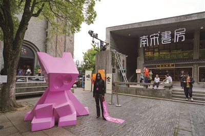 ⑤工作人员在鼓楼小广场上的一处名为“ONE兔”的艺术装置前拍摄“清河坊时尚国潮季”的宣传照。