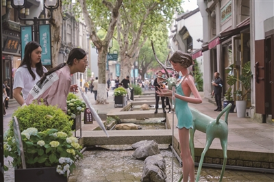 游客在清河坊历史街区内观赏“清河坊时尚国潮季”的街头艺术装置。