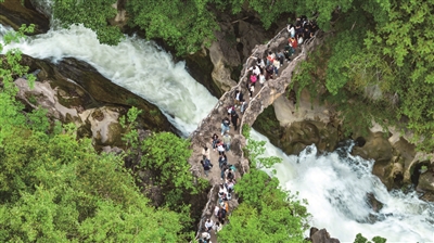5月2日,游客在贵州省安顺市天星桥景区游览(无人机照片)。