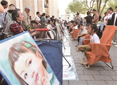5月1日,游客在哈尔滨中央大街上画肖像画。
