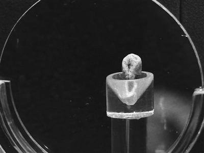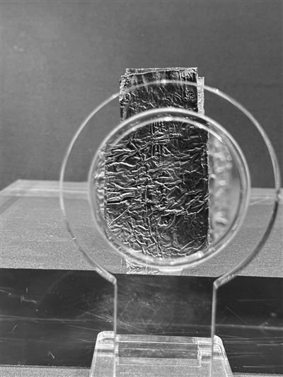 它的外表并不光滑,褶皱覆盖全身。有点类似把一张揉皱的纸重新舒展开。透过放大镜,可以清楚地看见“金叶子”上的纹理,朝外展出的这一面印着几个大字,“陈二郎十分金叶子”,代表着当时铸造金叶子的工坊以及工匠的名称。