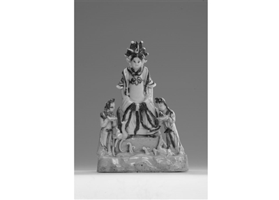 塑像底座为海水波浪形,塑有浪花两朵。观音及童子、龙女的头饰、面部、服装及托盘中的果品,用青花或褐彩装饰。